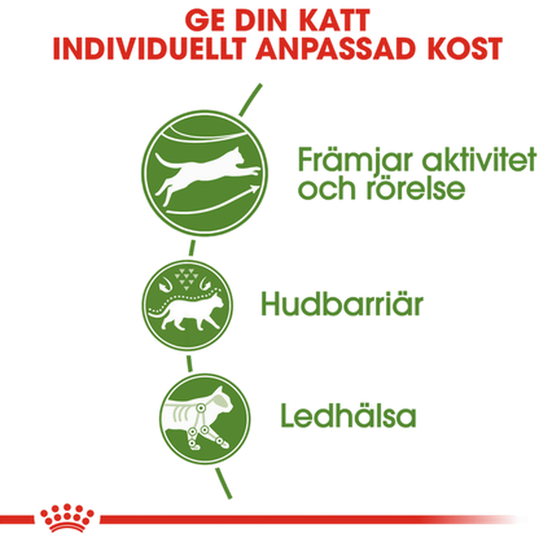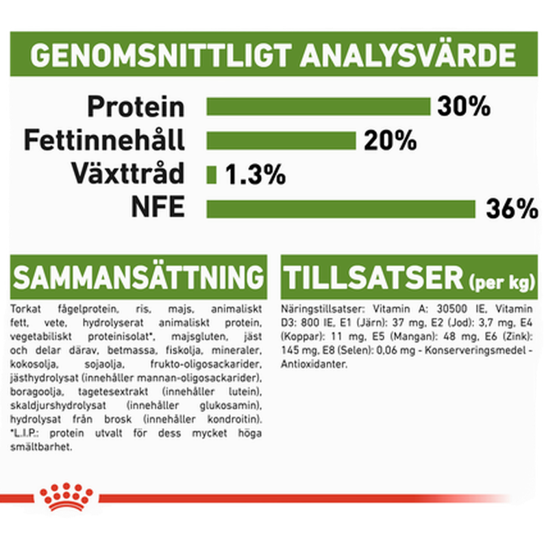 Torkat fågelprotein, ris, majs, animaliskt fett, vete, hydrolyserat animaliskt protein, vegetabiliskt proteinisolat*, majsgluten, jäst och delar därav, betmassa, fiskolja, mineraler, kokosolja, sojaolja, frukto-oligosackarider, jästhydrolysat (innehåller mannan-oligosackarider), boragoolja, mjöl av ringblomma, skaldjurshydrolysat (innehåller glukosamin), hydrolysat från brosk (innehåller kondroitin).