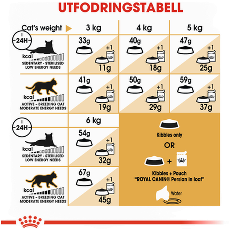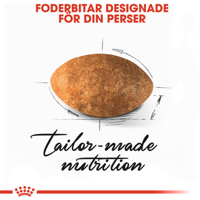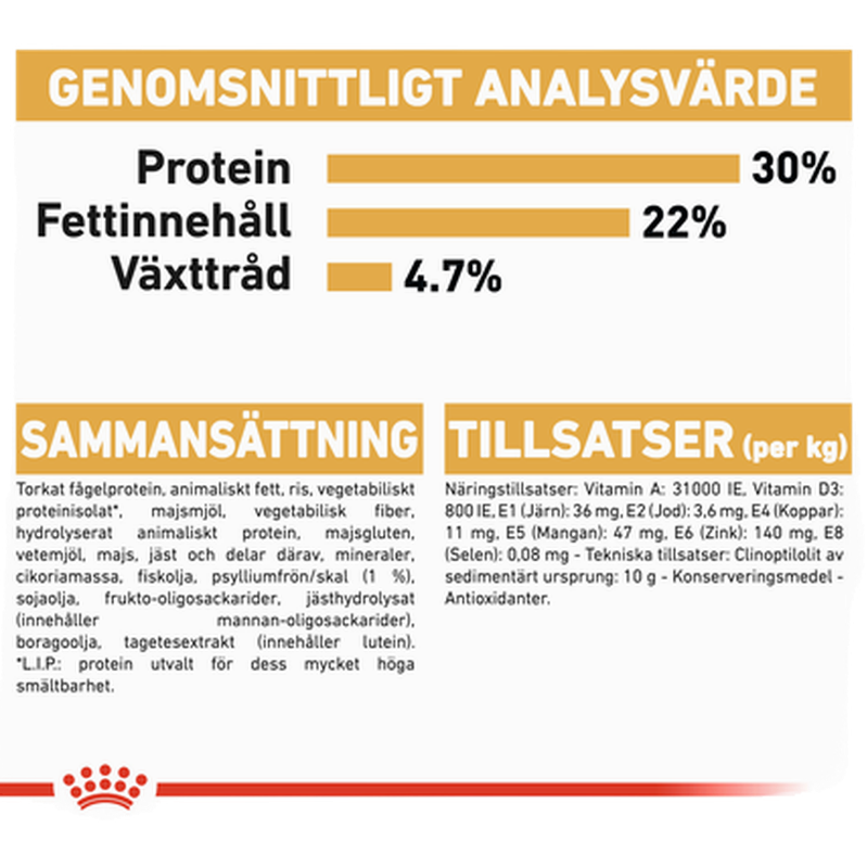 Torkat fågelprotein, animaliska fetter, ris, vetegluten*, majsmjöl, vegetabiliska fibrer, hydrolysat av animaliska proteiner, majsgluten, vetemjöl, majs, jästprodukter, mineraler, cikoriamassa, fiskolja, sojaolja, psylliumfrön/skal (0,50 %), frukto-oligosackarider, jästhydrolysat (innehåller mannan-oligosackarider), boragoolja, mjöl av ringblomma.