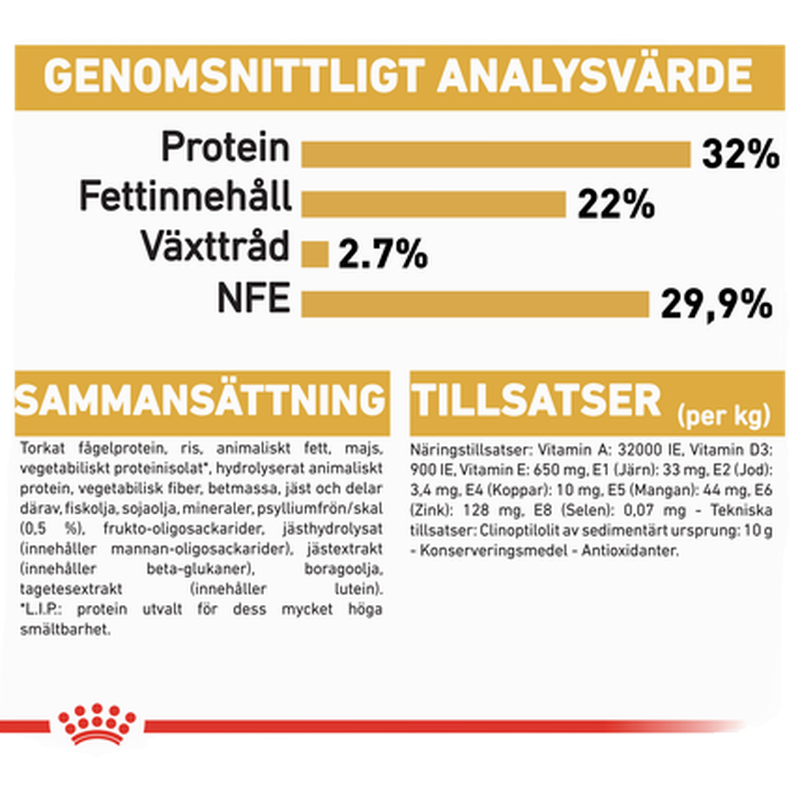 Torkat fågelprotein, ris, animaliska fetter, majs, vetegluten*, hydrolyserade animaliska proteiner, sojafiber, betmassa, jästprodukter, mineraler, fiskolja, sojaolja, frukto-oligosackarider, psylliumskal och -frö (0,35 %), majsmjöl, jäst (källa till mannan-oligosackarider och beta-glukaner), boragoolja, mjöl av ringblomma.