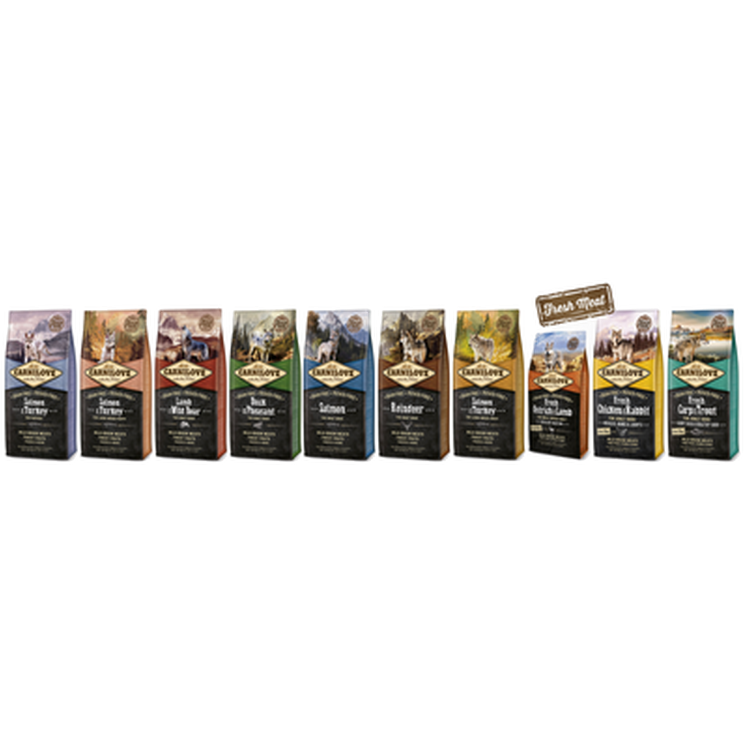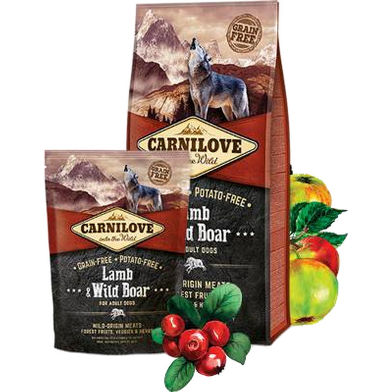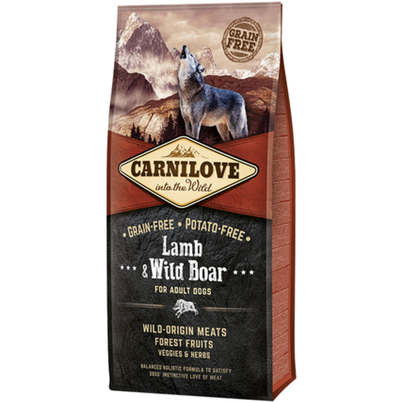 Köttmjöl från vildsvin (30 %), köttmjöl från frigående lamm (25 %), gula ärter (20 %), kycklingfett (med tokoferoler som konserveringsmedel, 10 %), kycklinglever (3 %), äpplen (3 %), tapiokastärkelse (3 %), laxolja (2 %), morötter (1 %), linfrö (1 %), kikärter (1 %), hydrolyserade kräftdjursskal (en källa till glukosamin, 0,026 %), broskextrakt (en källa till kondroitin, 0,016 %), bryggerijäst (en källa till mannanoligosackarider, 0,015 %), cikoriarot (en källa till fruktooligosackarider, 0,01 %), yucca schidigera (0,01 %), alger (0,01 %), psylliumfrö (0,01 %), timjan (0,01 %), rosmarin (0,01 %), oregano (0,01 %), tranbär (0,0008 %), blåbär (0,0008 %), hallon (0,0008 %).