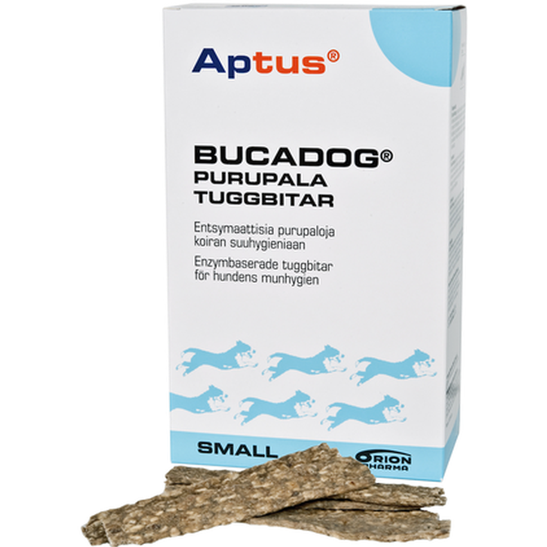 Entsyymipohjaiset koirien herkkupalat suuhygienian parantamiseksi. Aptus Bucadog -purupalat vähentävät plakkia, ehkäisevät pahaa hengitystä ja säilyttävät suun normaalin mikroflooran. Suositellaan käytettäväksi eläinlääkärin tekemän hammaskiven poiston jälkeen. Aptus® Bucadog Purupalat Small 20-25 kpl.