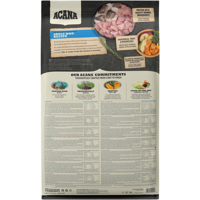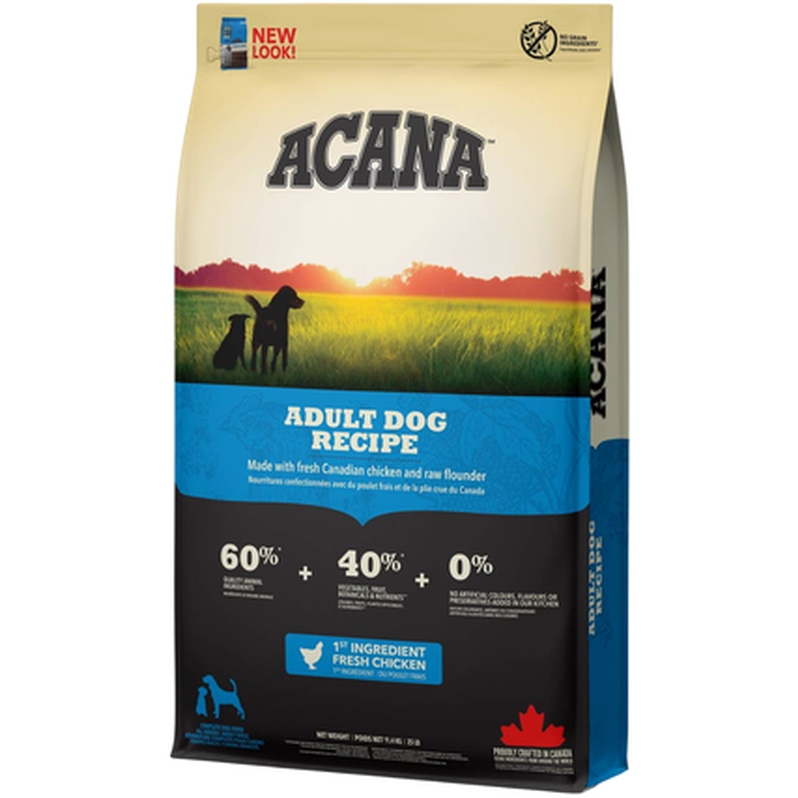 Färsk kyckling (14 %), torkat kycklingkött (14 %), hela röda linser, hela gröna ärtor, hela kikärtor, färska kycklinginälvor (lever, hjärta) (5,5 %), torkad sill (5 %), kycklingfett (5 %), torkat kalkonkött (5 %), ägg (4 %), rå flundra (4 %), fiskolja (3 %), hela gröna linser, hela gula ärtor, ärtfiber, ärtstärkelse, rå kycklinglever (0,5 %), salt, torkad kelp, färska hela äpplen, färsk hel butternutsquash, färska hela morötter, färska hela päron, färsk hel pumpa, färsk hel zucchini, färska rödbetsblad, färsk grönkål, färsk spenat, färska majroveblad, färska hela blåbär, färska hela tranbär, färska hela saskatoonbär, kardborrerot, lavendel, läkemalva, mjölktistel, nypon, gurkmeja.