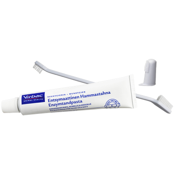 Hammashygieniasetti koirille ja kissoille - Hammashoitosetti sisältää hammastahnan, sormiharjan ja kaksipuolisen hammasharjan. Kätevä hammashoitosetti sisältää kaiken, mitä koiranomistaja tarvitsee pitääkseen koiransa hampaat terveinä. Hampaidenhoitosetti sisältää hammastahnaa, käytännöllisen sormiharjan sekä taivutetun kaksoishammasharjan koiran hampaiden puhdistamiseen.