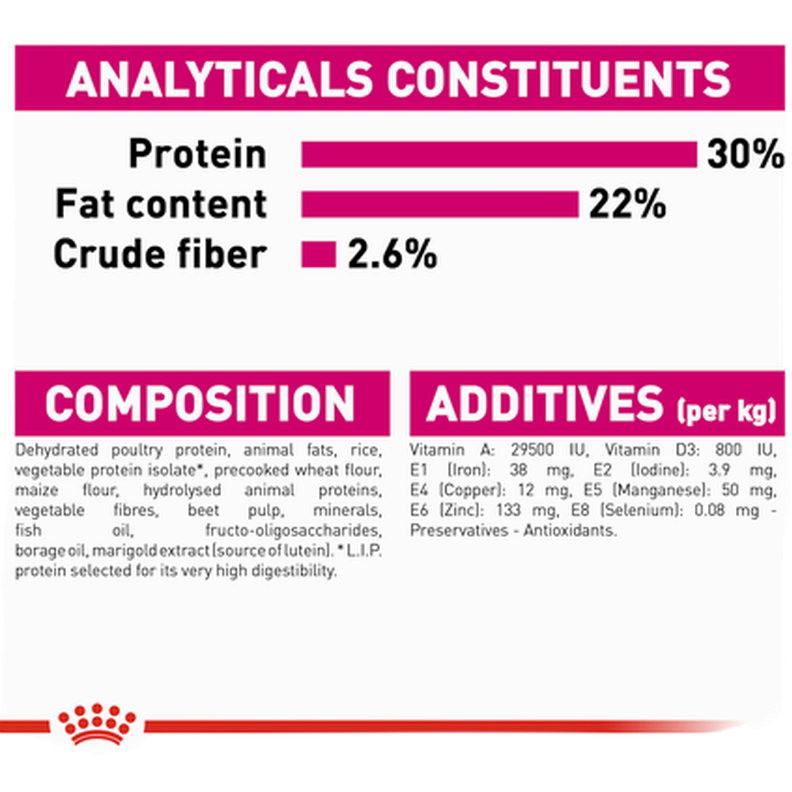 Kuivattu lintuproteiini, eläinrasva, riisi, kasviproteiini-isolaatti*, esikypsennetty vehnäjauho, maissijauho, hydrolysoitu eläinproteiini, kasvikuitu, sokerijuurikasmassa, kivennäisaineet, kalaöljy, frukto-oligosakkaridit, boorageöljy, kehäkukkajauho.