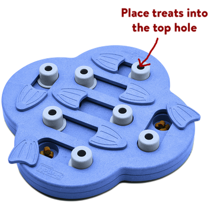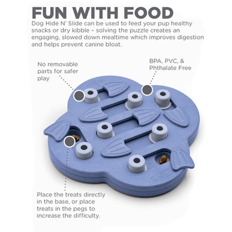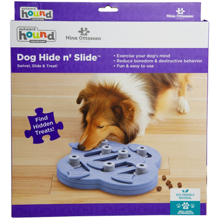 Hide'n Slide Composite on keskivaikean tason ruoka-aktivointipeli koirille. Vaikeustaso 2, Nina Ottosson by Outward Hound -tuotemerkiltä. Laita herkkuja tai ruokaa aukkoihin ja palikoiden sisälle palikan yläosassa olevan aukon kautta. Peitä herkuilla täytetyt aukot "siivillä". Laita peli lattialle ja näytä koiralle mitä tehdä. Koirat ovat fiksumpia kuin uskomme, niille pitää vain opettaa miten tehdä! Pyöritä "siipiä" vaihdellaksesi vaikeustasoa. Näytä myös, kuinka palikoita siirretään, jotta herkkuihin pääsee käsiksi. FROZEN PUZZLE: sekoita hieman lihaisaa koiranruokaa tai raakaruokaa veteen, laita jokaiseen lokeroon nokare seosta, tai laita jokaiseen lokeroon makkara-/herkkupala ja kaada päälle hieman vettä. Laita peli pakkaseen, kunnes lokeroissa oleva ruoka on jäätynyt. Täydellinen energisille koirille, lämpimään säähän tai erityisen pitkään leikkituokioon.