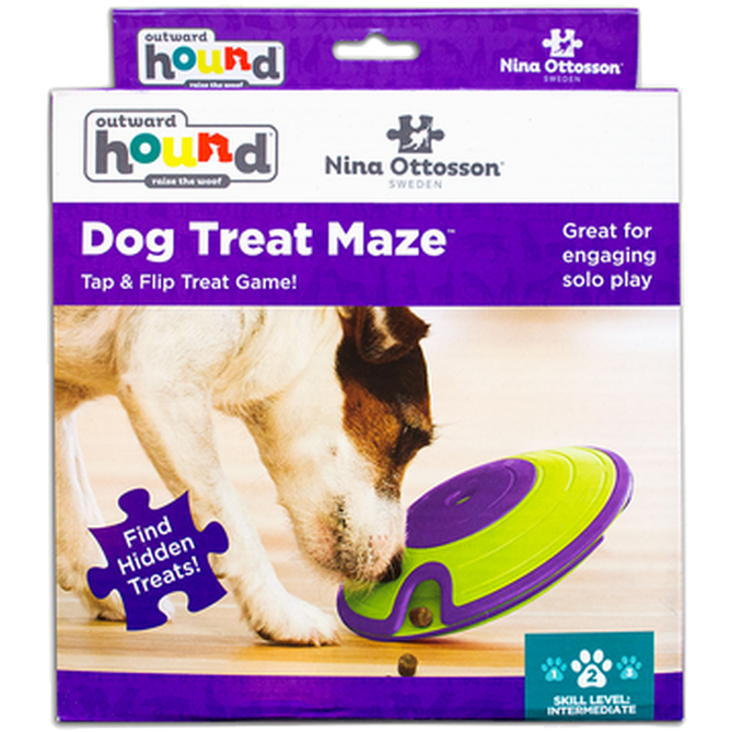 Treat Maze keskivaikean tason ruoka-aktivointipeli koirille. Vaikeustaso 2 Nina Ottosson by Outward Hound -tuotemerkiltä. Täytä Treat Maze herkuilla tai ruoalla ja anna koiran samalla katsoa ja haistella. Laita peli lattialle ja näytä koiralle, kuinka sen pitää keikuttaa ja pyörittää lelua, jotta herkut tulevat ulos lelun sivuilta. Koirat ovat fiksumpia kuin uskomme, niille pitää vain opettaa miten tehdä! Laita herkkuja tai ruokaa keskellä olevan aukon molemmille sivuille. Kun koira liikuttaa lelua, herkut menevät labyrintin läpi ja tulevat ulos ulkoreunassa olevan kahden aukon kautta. Kun olet täyttänyt Treay Maze -aktivointilelun herkuilla tai ruoalla, ravista lelua kevyesti, jotta koirasi näkee ja ymmärtää, että lelun sisällä odottaa herkullinen palkka.
