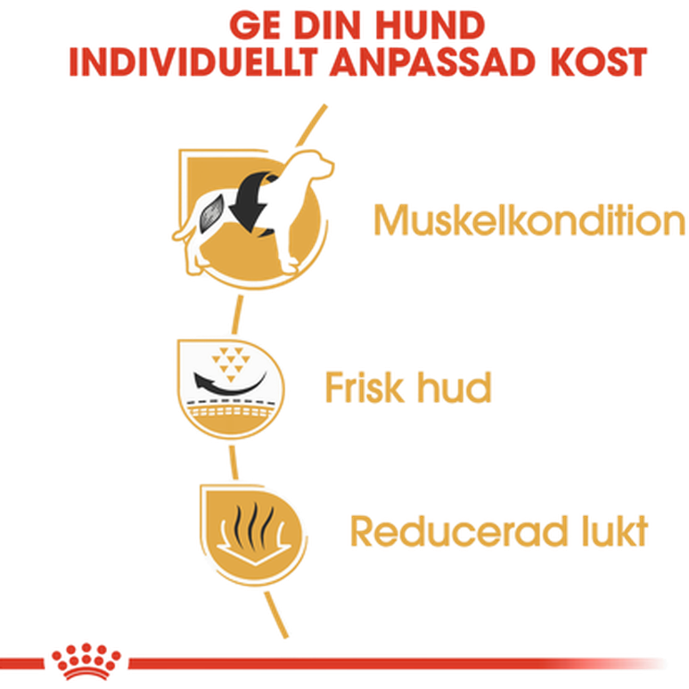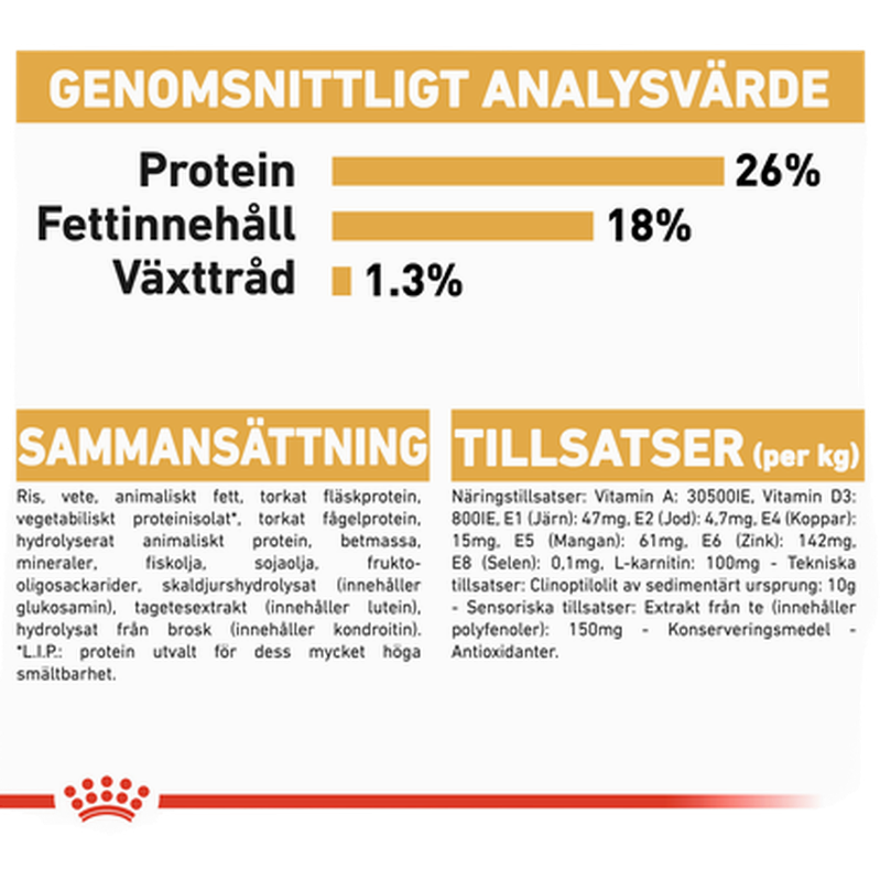 Riisi, vehnä, eläinrasva, kuivattu sianlihaproteiini, kasviproteiini-isolaatti*, kuivattu siipikarjan proteiini, hydrolysoitu eläinproteiini, juurikasmassa, kivennäisaineet, kalaöljy, soijaöljy, frukto-oligosakkaridit, äyriäishydrolysaatti (sisältää glukosamiinia), kehäkukkajauho, rustohydrolysaatti (sisältää kondroitiiniä) *IP: proteiini on valittu erittäin hyvän sulavuuden vuoksi.