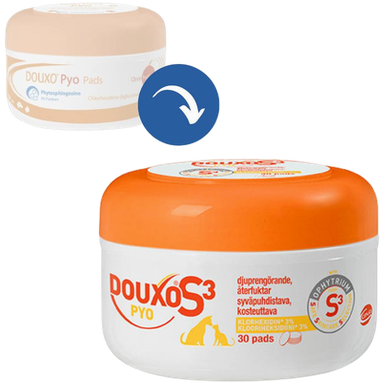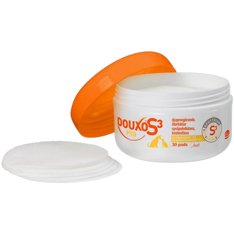 Douxon syväpuhdistavat puhdistuslaput tasapainottavat ja kosteuttavat epäpuhtaan ihon ja ovat tehokkaita sientä vastaan. Douxo Klooriheksidiinilappuja käytetään epäpuhtaalle iholle kissoilla, koirilla, jyrsijöillä ja hevosilla. Douxo Pyo Pads -lappuja voidaan käyttää esim. likaisissa ihopoimuissa, varpaiden väleissä ja polkuanturoissa, korvalehdissä ja suupielissä.