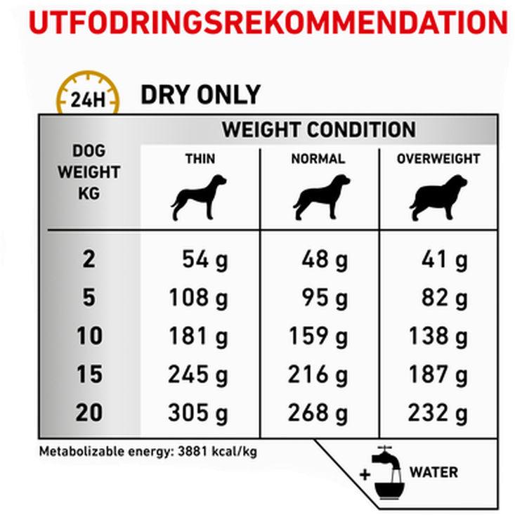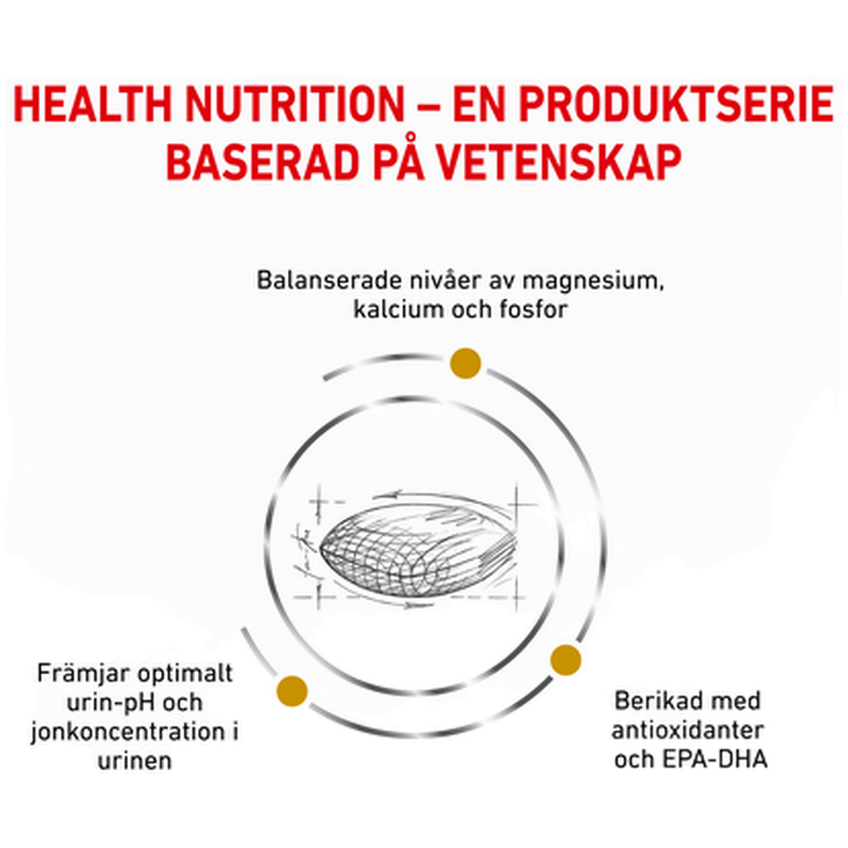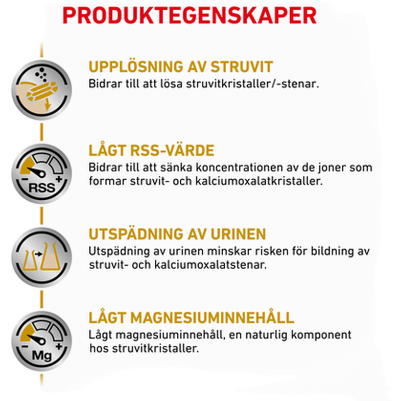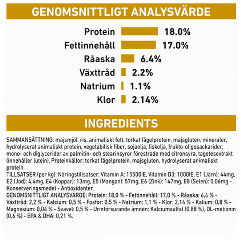 Proteiini: 18 % - Rasva: 17 % - Raakatuhka: 6,6 % - Raakakuitu: 2,3 % - Kalsium: 0,5 % - Fosfori: 0,5 % - Natrium: 1,2 % - Kloori: 2,21 % - Kalium: 0,8 % - Magnesium: 0,05 % - Rikki: 0,3 % - Virtsan happamuutta lisäävät aineet: kalsiumsulfaatti (0,55 %), DL-metioniini.