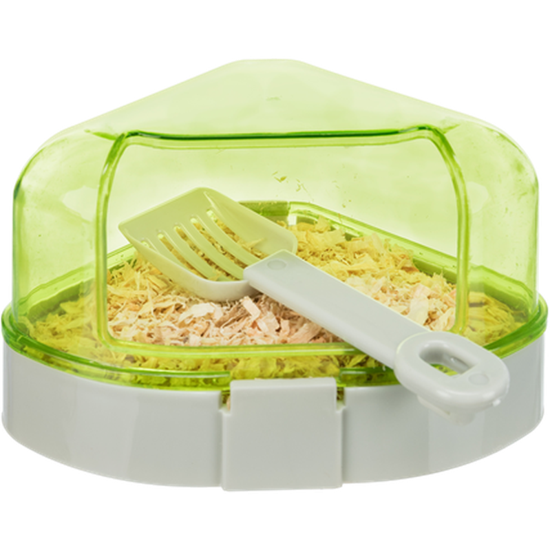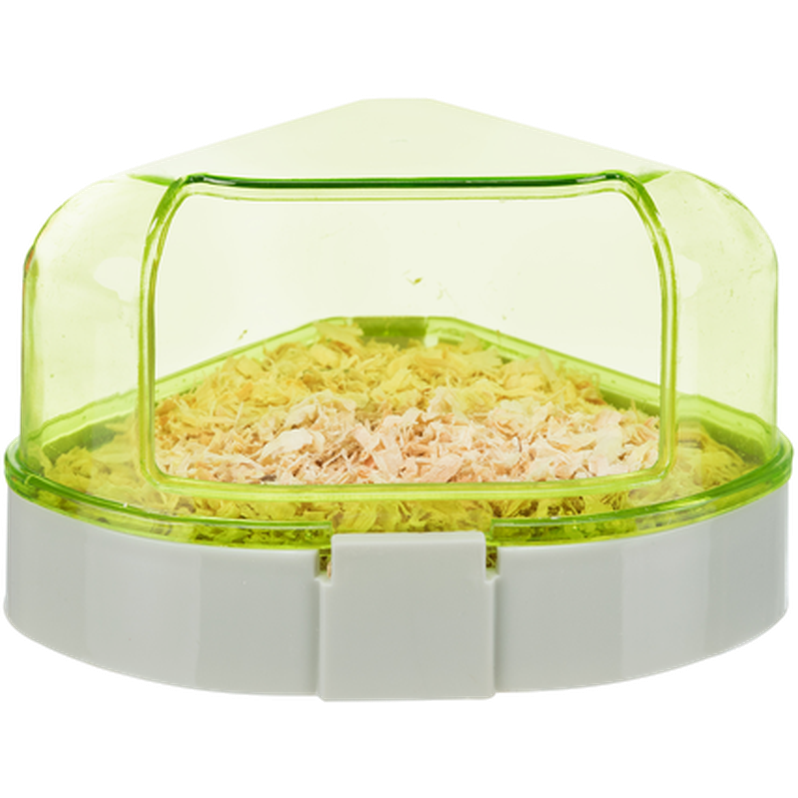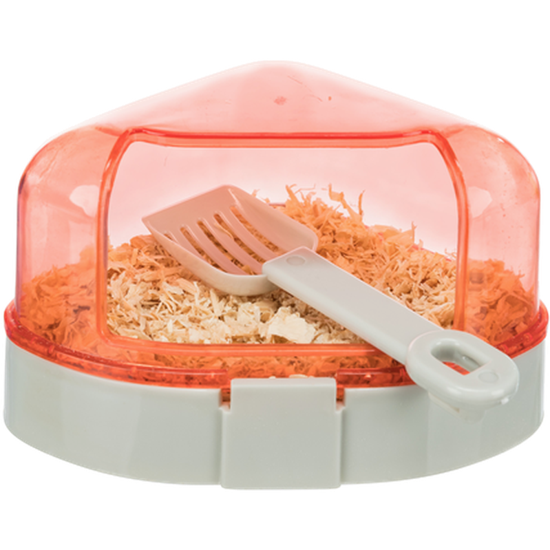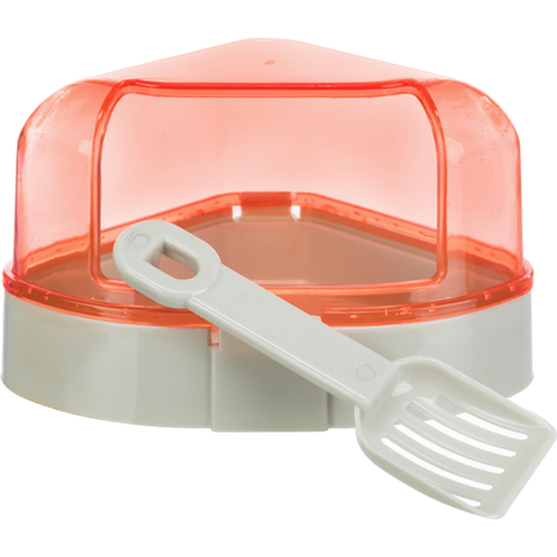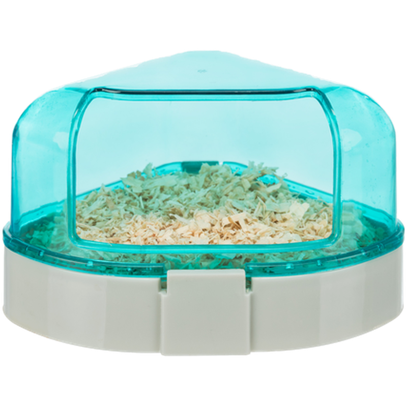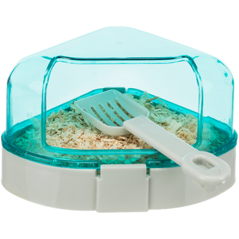 Kätevä muovinen nurkkavessa kääpiöhamstereille. Hamsterivessassa on katto ja mukana on vessalapio. Nurkkavessa pieneläinhäkkeihin - katollinen malli, sisältää lapion - Valmistettu muovista - Saatavilla värit vaaleanpunainen, sininen ja vihreä, alaosa on aina harmaa. Trixie Corner Toilet With Hood
