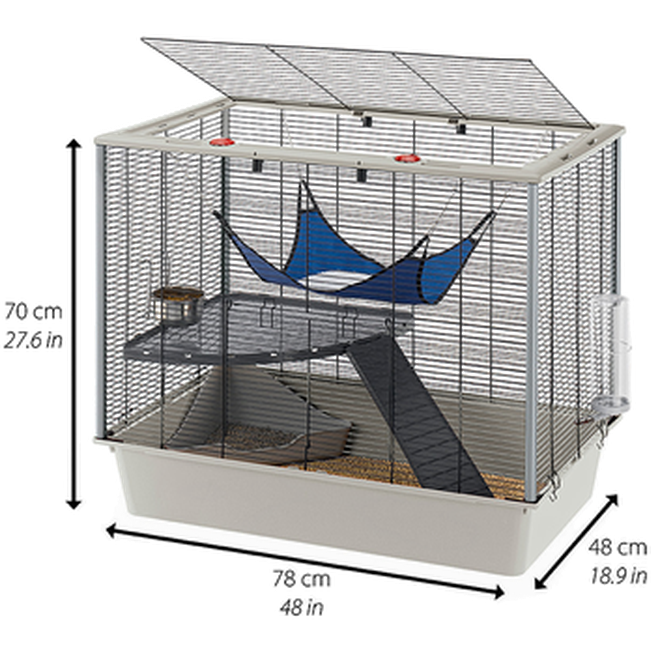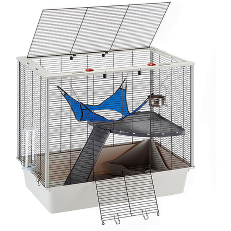 Ferplast Furat KD - Hyvä häkki hyllytasoilla rotille. Täysin varusteltu riippumatolla, kulmavessalla, hyllytasolla, tikkailla, ruokakulholla ja vesipullolla. Furat KD Ferplastilta on rotille sopiva häkki suurella ovella etupuolella ja täysin avattavalla katolla yksinkertaisemman pääsyn ja puhdistuksen mahdollistamiseksi.